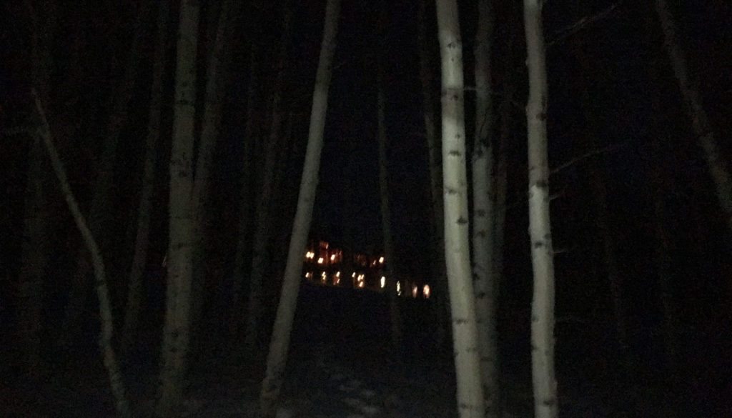 First, you will want to make reservations. You can valet park at the Ritz Carlton Bachelor Gulch. Winter 2016/2017 the discounted parking for Zach’s Cabin dinner guests is $10 payable by either cash or credit card at the front desk. Grab a mountain map and head out the back patio straight up the mountain. You will veer right at the top of the first lift and then keep on going straight up. It is about a 2.5 to 3 mile hike with an 1800 foot elevation gain so is a pretty good workout. Expect it to take about an hour to hike, give or take a few minutes depending on your speed.